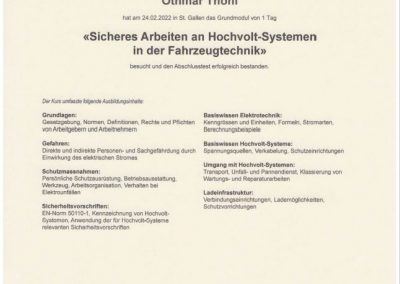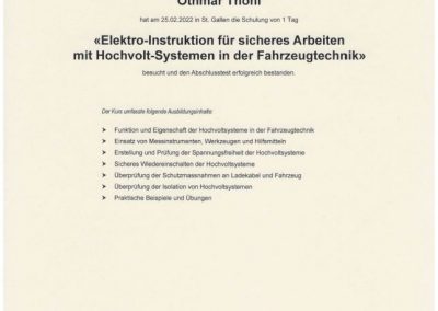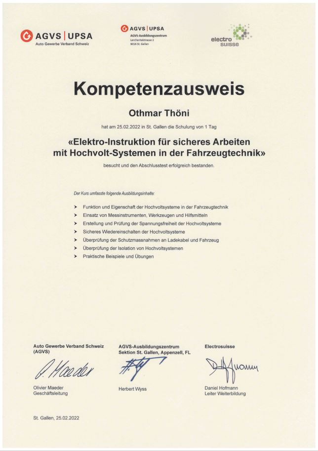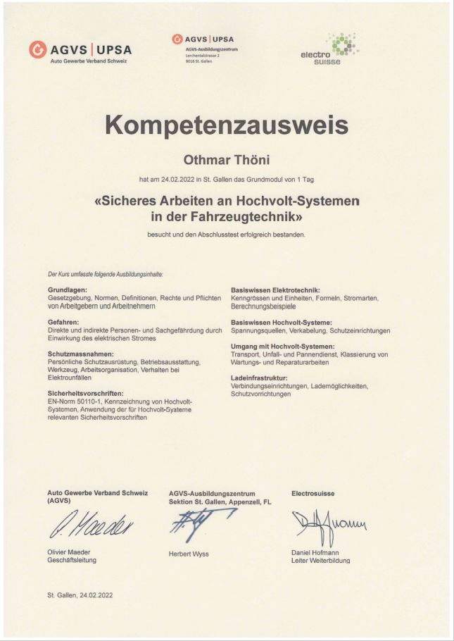 Sicher in die Zukunft der Elektromobilität: In der Fahrzeugtechnik sind Elektromotoren auf dem Vormarsch. Da die Berührung mit Spannungen ab 50 Volt lebensgefährlich sind und sowohl Hybrid- als auch Elektro-Fahrzeuge diese Spannungswerte mit bis zu 800 Volt bei weitem übersteigen, braucht es eine spezielle Ausbildung, um solche Systeme zu diagnostizieren und zu reparieren. Unser Team hat sich in einem Kurs nicht nur die Theorie, sondern auch das Praxiswissen vermitteln lassen und den Kompetenzausweis für «Sicheres Arbeiten an Hochvoltsystemen in der Fahrzeugtechnik» erlangt. Das ganze Team ist somit fit für die E-Mobilität und freut sich in Zukunft auch Elektroautos aller Marken bei uns in Aadorf zu reparieren.